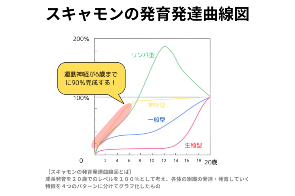 スキャモンの発育発達曲線でも示されているように、神経系は幼少期に急速に発達し、筋力や持久力は思春期以降に大きく伸びていきます。